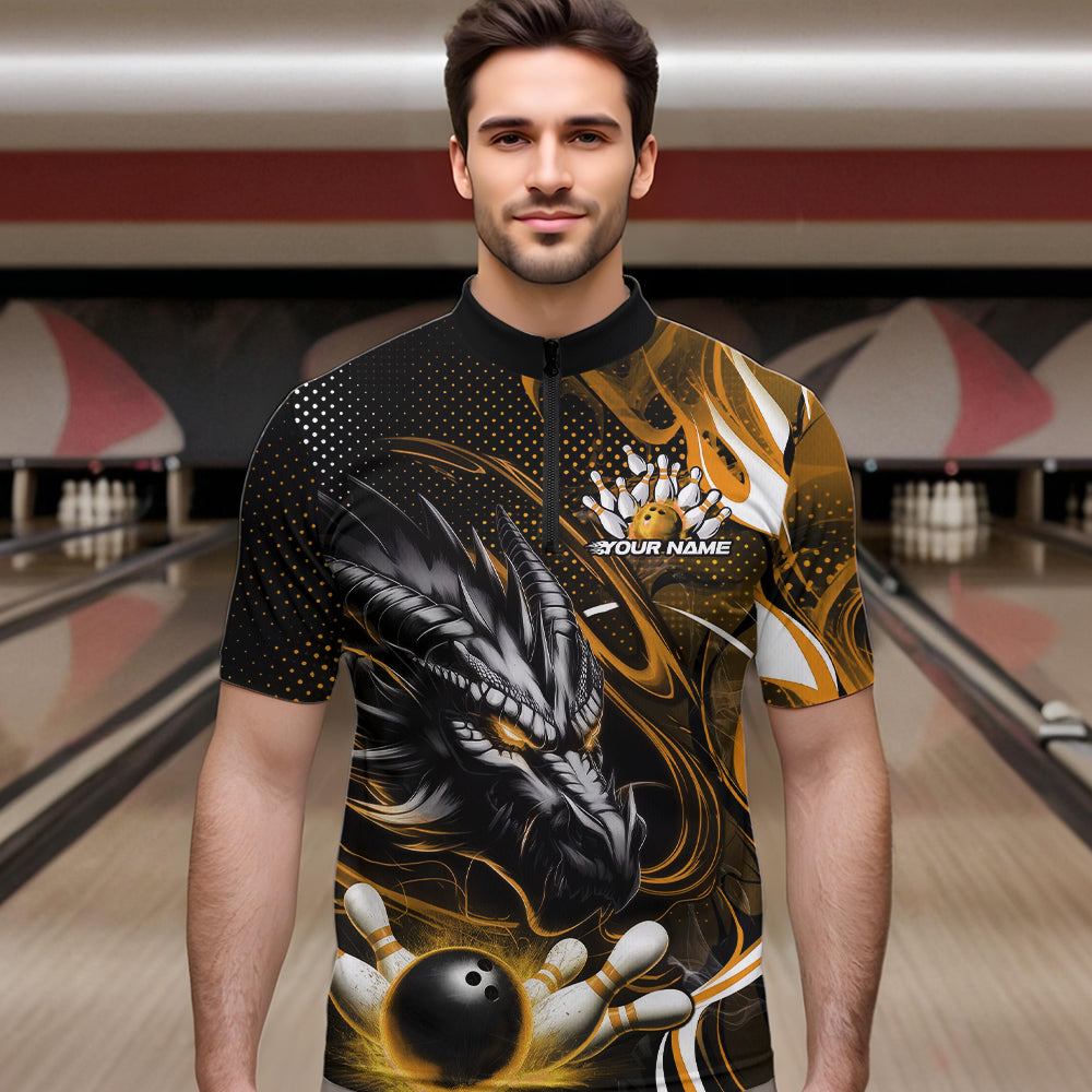 Custom Black And Yellow Flame Dragon Bowling Jerseys, Dragon Bowling Team Men Quarter-Zip Shirts IPHW8921