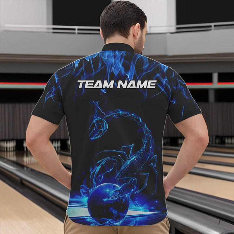 Custom Black And Blue Flame Scorpio Zodiac Bowling Men Quarter-Zip Shirts, Scorpion Bowling Team IPHW8969