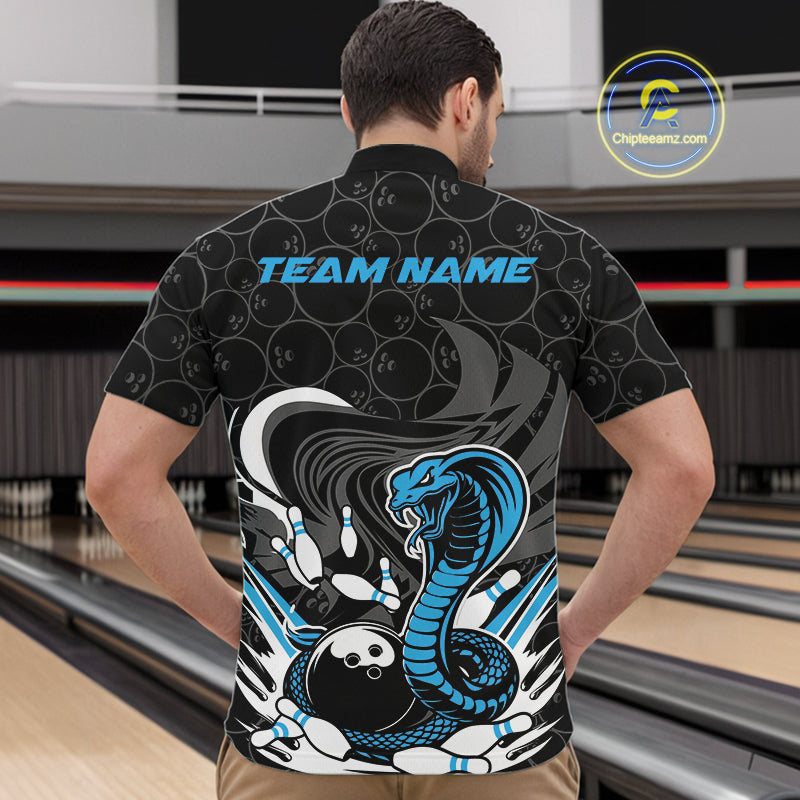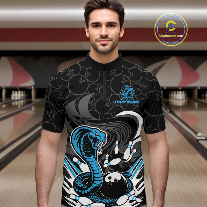 Custom Black And Blue Cobra Snake Bowling Quarter-Zip Shirts For Men, Cobra Bowling Team Shirt IPHW9702