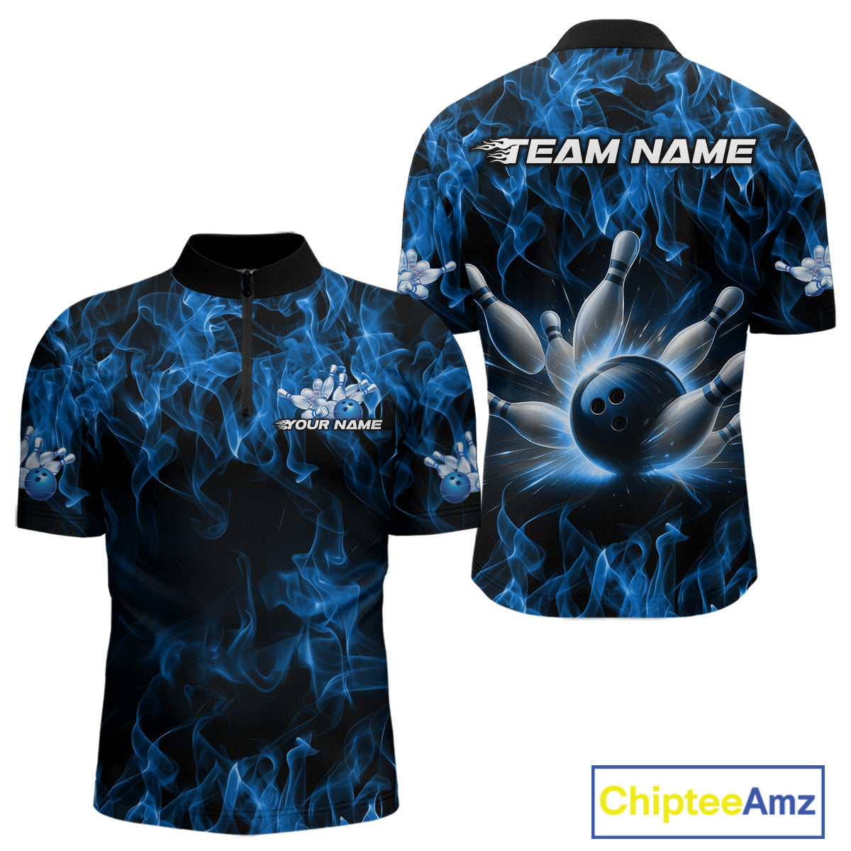 Custom Black And Blue Flame Bowling Team Men Quarter-Zip Shirts, Bowling Tournament Shirt IPHW9754