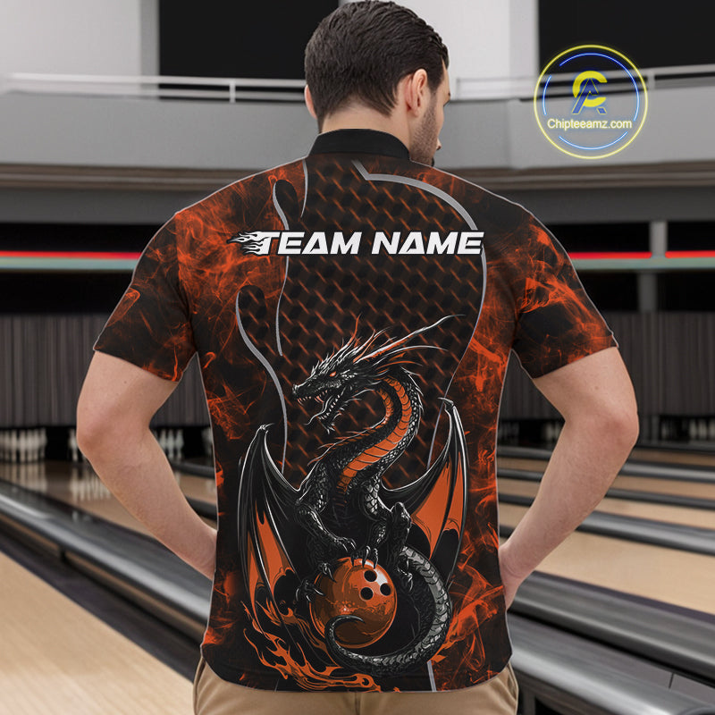 Custom Black And Orange Fire Flame Dragon Bowling Men Quarter-Zip Shirt, Dragon Bowling Jersey IPHW9867