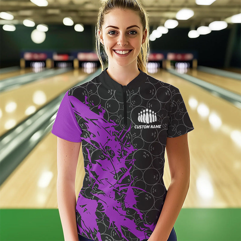Black And Purple Custom Bowling Tournament Womens Quarter-Zip Shirts, Bowling Team Jerseys IPHW8423