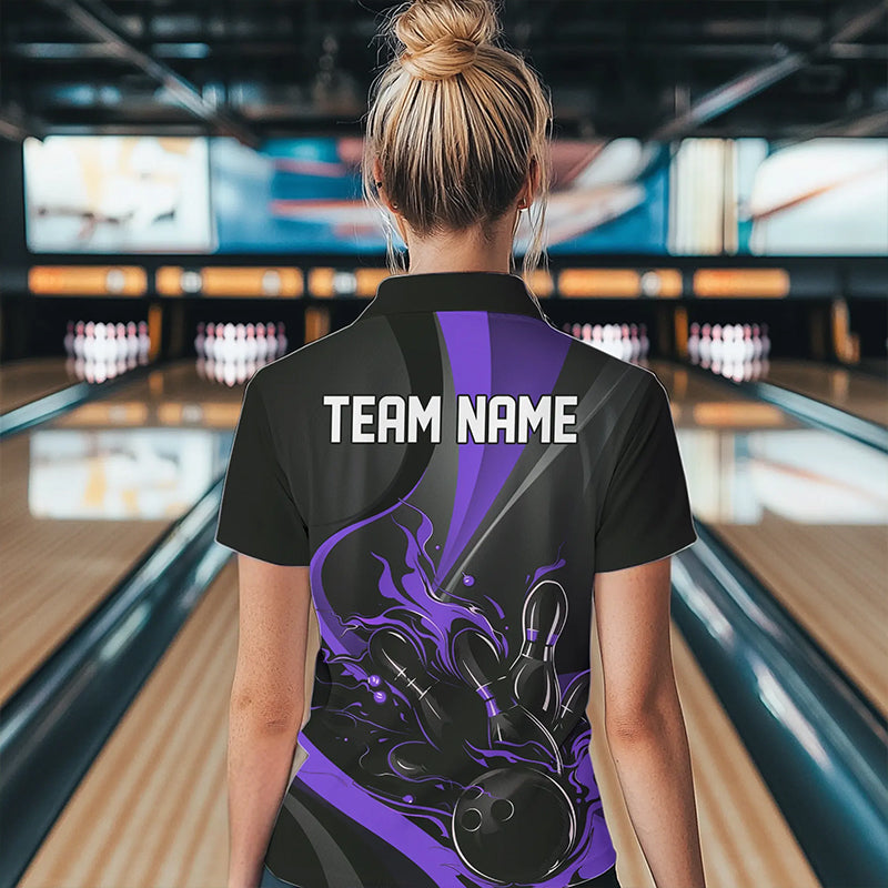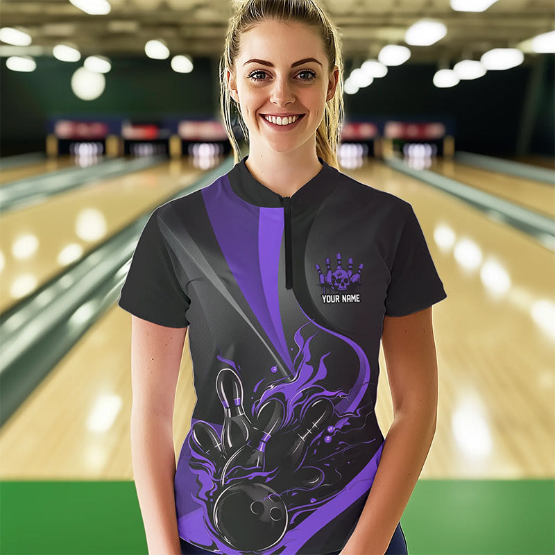Custom Black And Purple Flame Bowling Quarter-Zip Shirts For Women, Fire Bowling Team Shirt IPHW8541