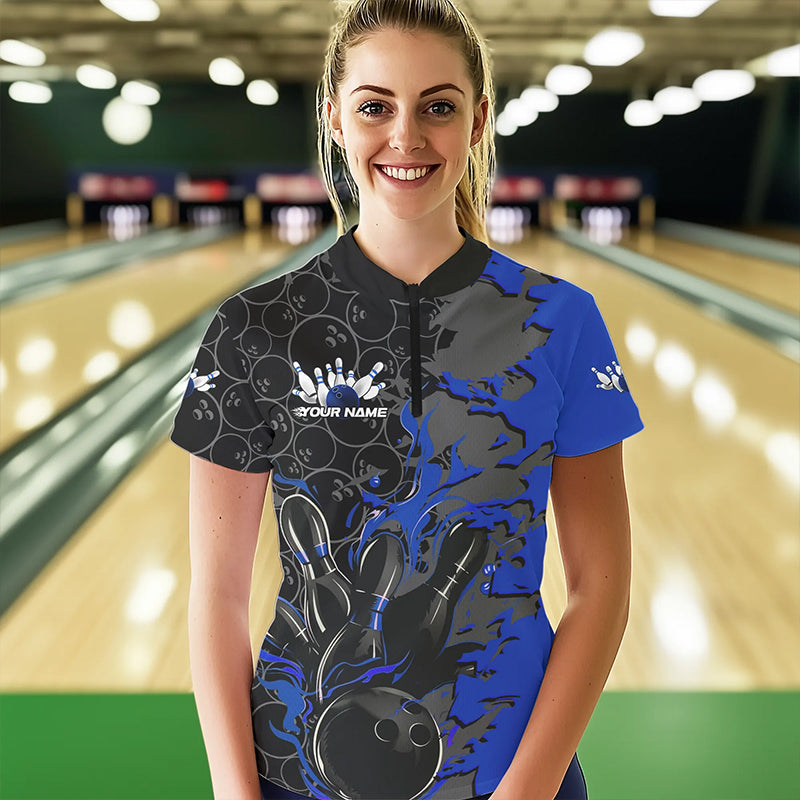 Custom Black And Blue Flame Bowling Womens Quarter-Zip Shirt, Bowling Tournament Uniform IPHW8617