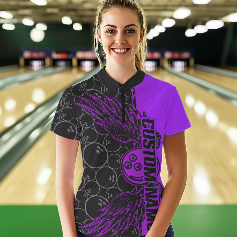 Black And Purple Custom Bowling Ball And Wings Womens Quarter-Zip Shirts, Team Uniform IPHW8693