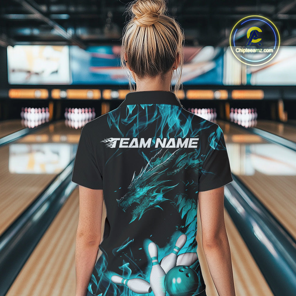 Custom Black And Blue Flame Dragon Bowling Women Quarter-Zip Shirts, Bowling League Shirt IPHW9334