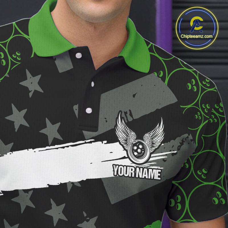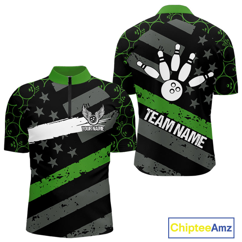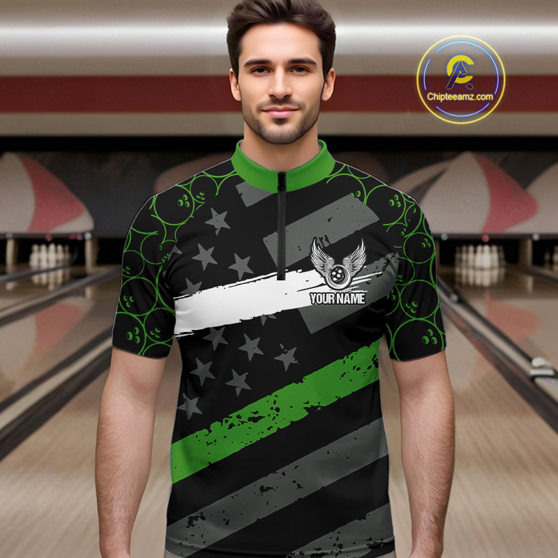 Black American flag Men bowling shirts Custom bowling camo Team Jerseys, gift for Bowlers | Green NQS10896