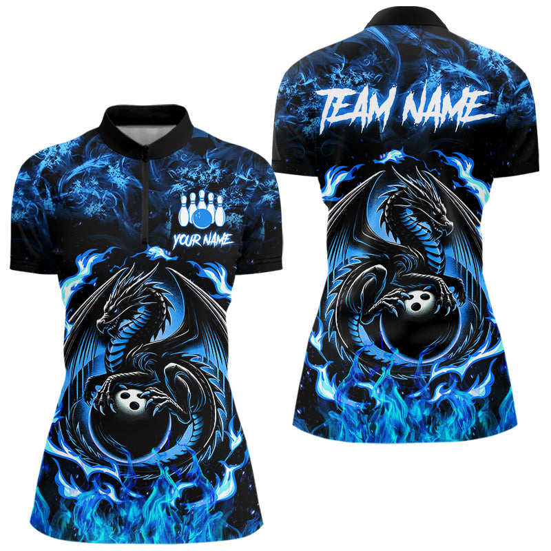 Black and Blue Flame Dragon bowling shirts for Women Custom Bowling Team Jersey, gift for Bowler NQS9607