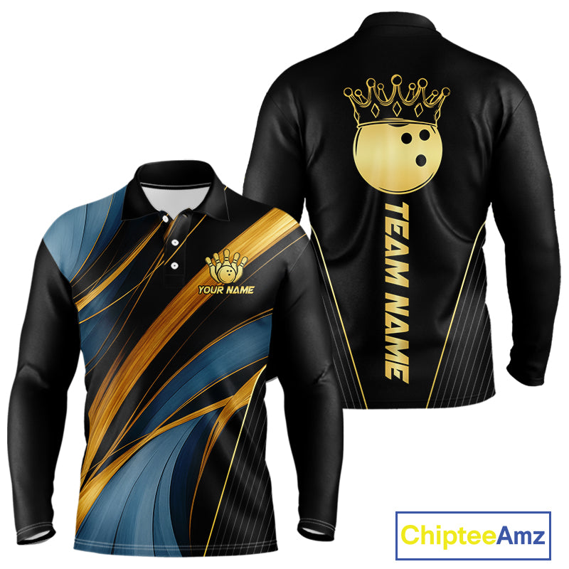 Blue and Gold Bowling ball Polo, Quarter Zip Shirts for Men Custom Bowling Outfit Team bowlers jersey NQS10032