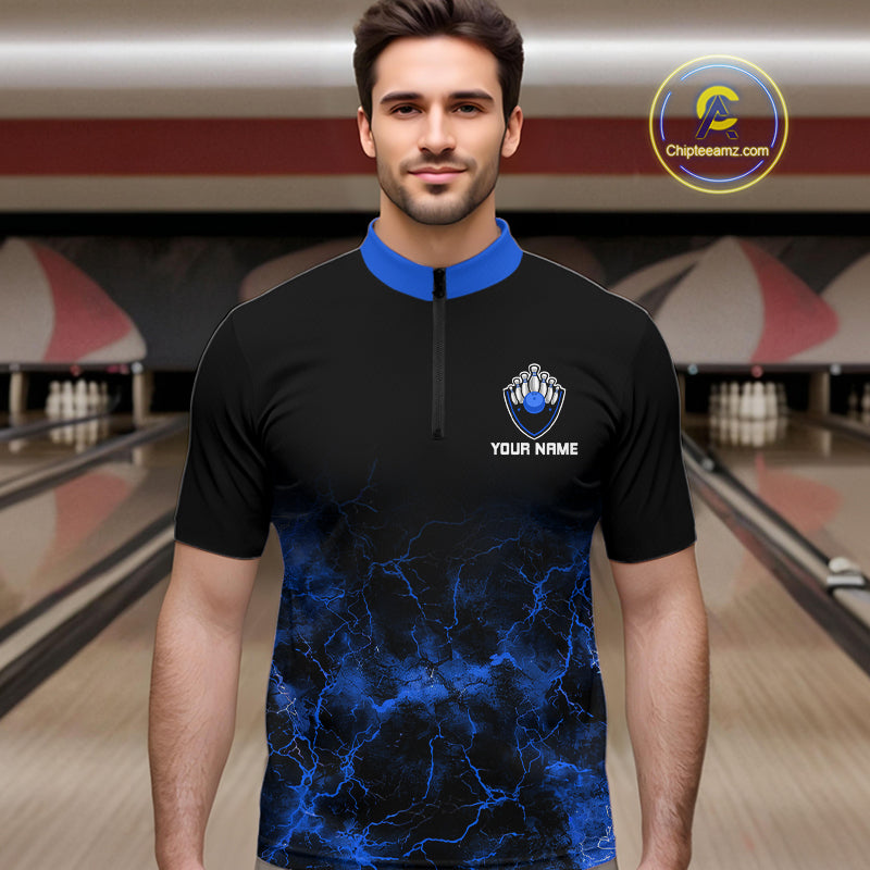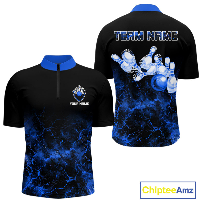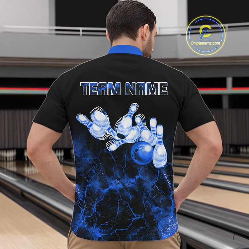 Personalized Men's bowling shirts Blue lightning Bowling Ball Pins bowling jerseys for Bowler NQS10633