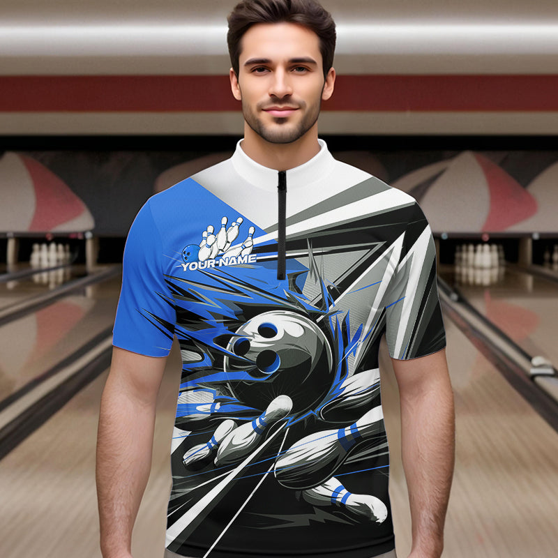 Custom Black And Blue Striking Bowling Quarter-Zip Shirts For Men, Team Uniform Bowlers Outfits IPHW8765
