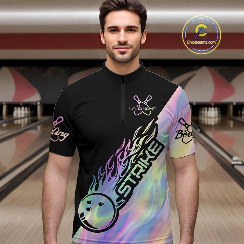 Custom Hologram Flame Strike Bowling Quarter-Zip Shirts For Men, Bowling Team Bowler Outfit IPHW9860