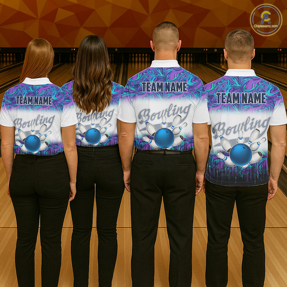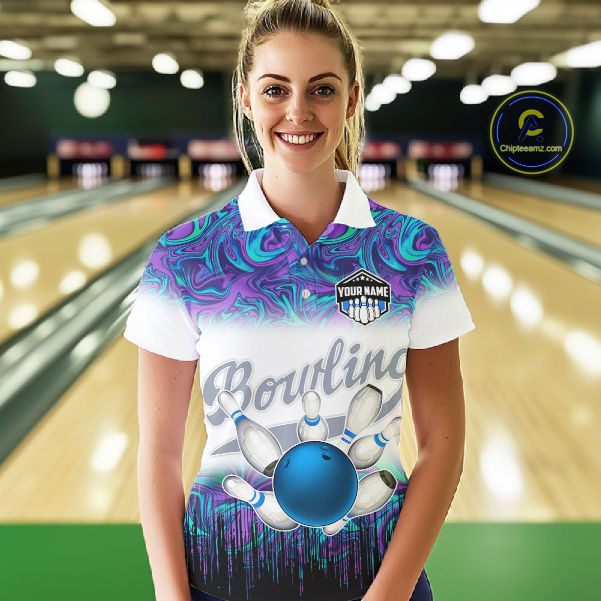 Women bowling polo shirts Custom blue purple marble pattern bowling Team Jerseys, gift for bowlers NQS7141