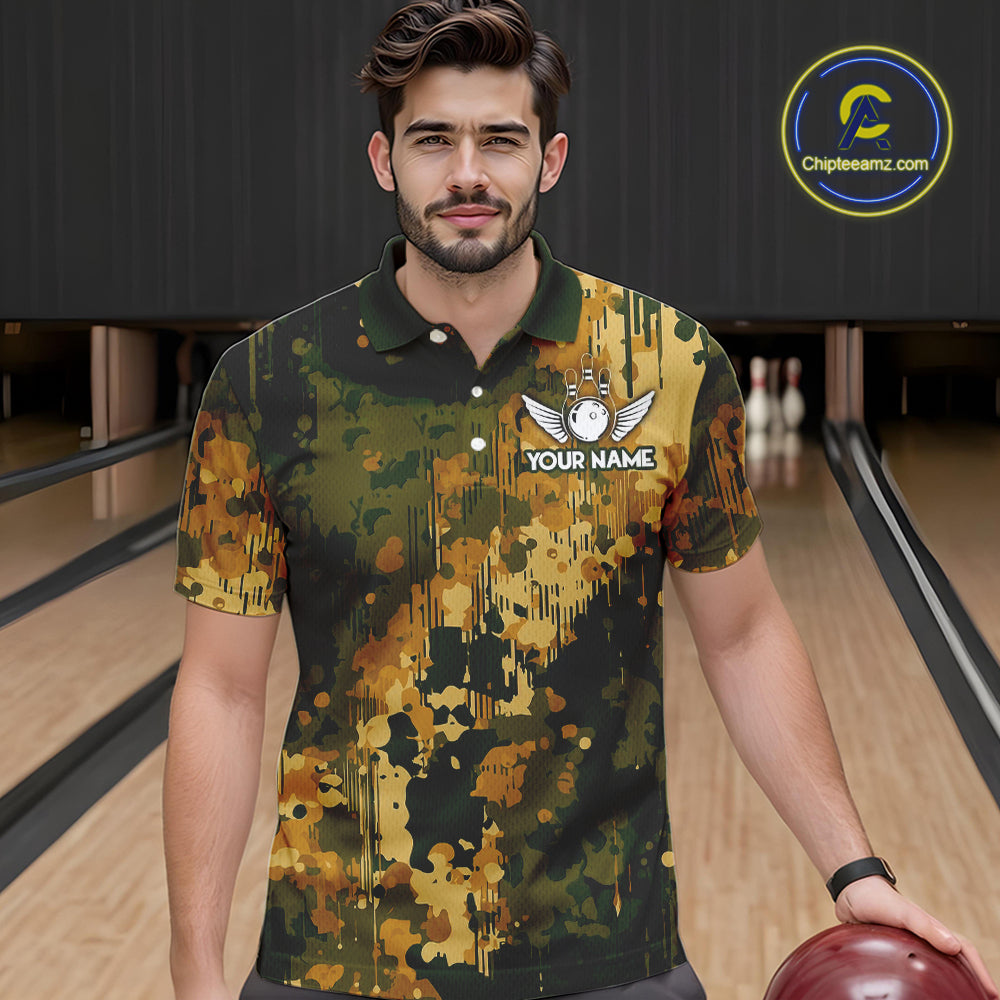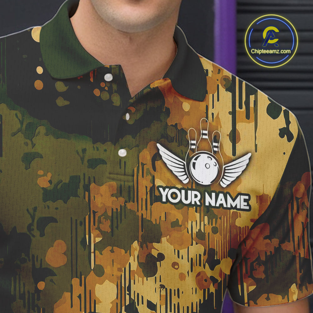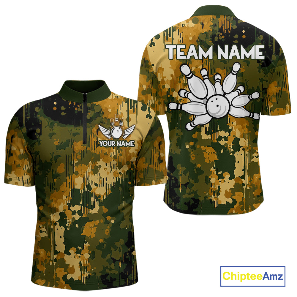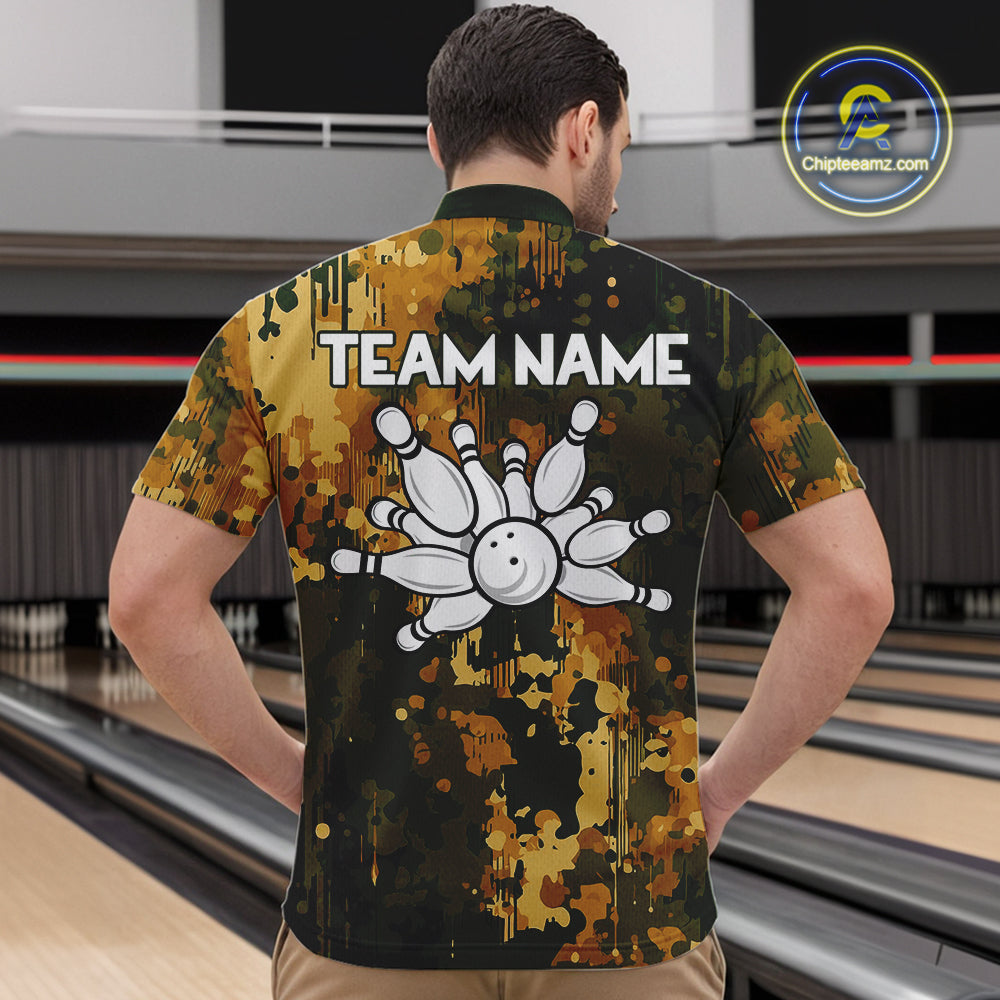 Yellow Camo Bowling Polo, Quarter Zip Shirts For Men Custom Bowling Team Jerseys, Gift For Bowlers NQS10456