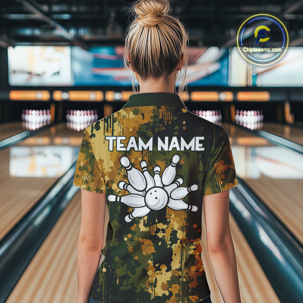 Yellow Camo Bowling Polo, Quarter Zip Shirts For Women Custom Bowling Team Jerseys, Gift For Bowlers NQS10456