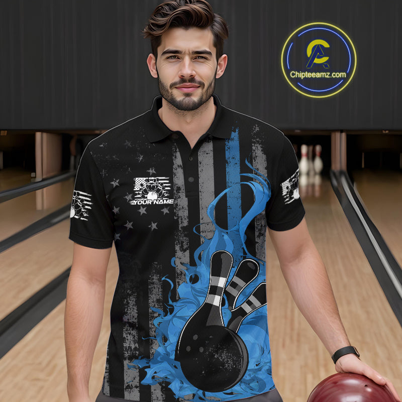 Custom Grunge Vintage Blue Thin Line US Flag Patriotic Men Polo Bowling Team Shirts IPHW10170