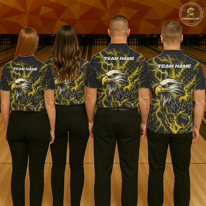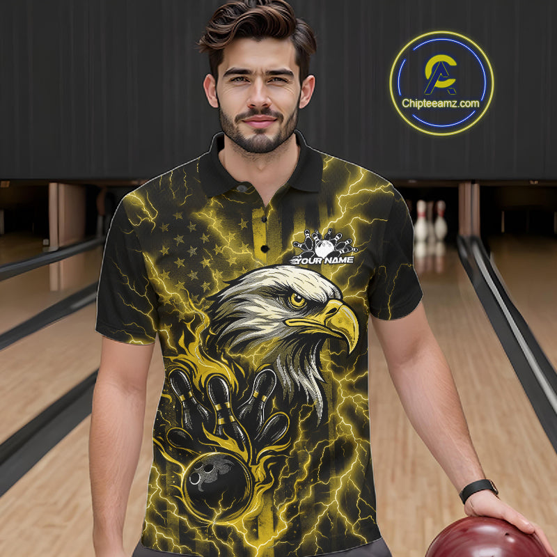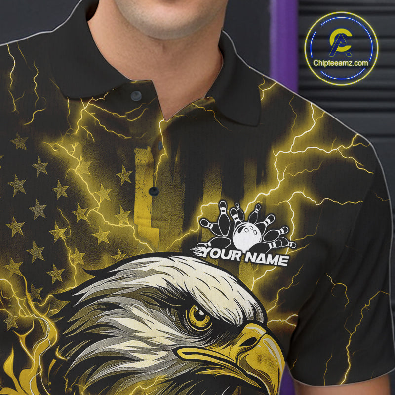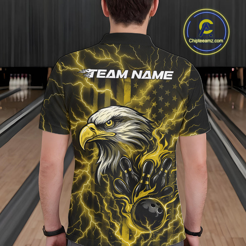 Custom Yellow Lightning Flame Eagle Men Bowling Shirt, Patriotic US Team Shirt IPHW10174