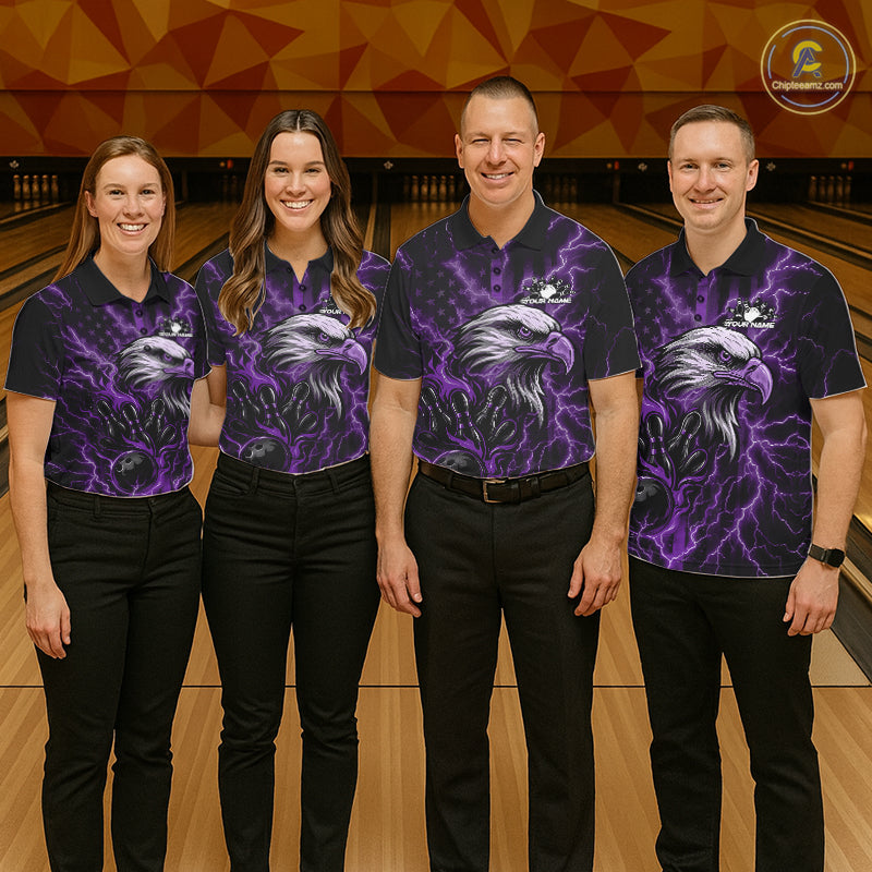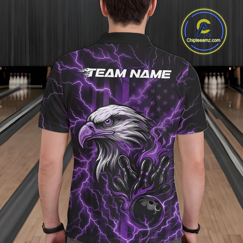 Custom Purple Lightning Flame Eagle Men Bowling Shirt, Patriotic US Team Shirt IPHW10175