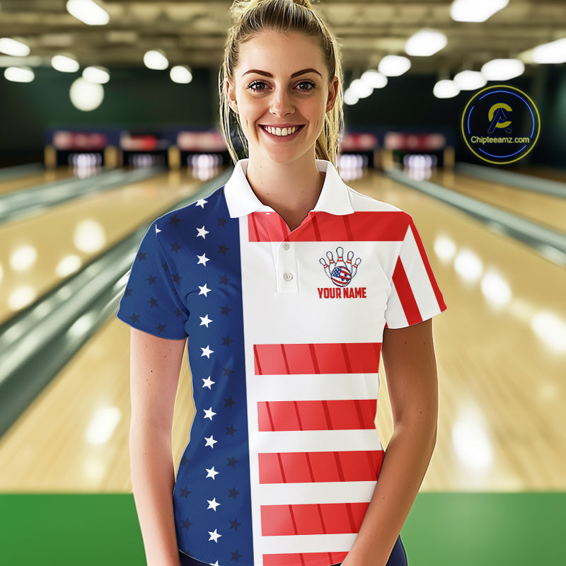 Red, White and Blue American Flag Bowling Shirts For Women Custom Patriotic Bowling Team Jerseys NQS11157