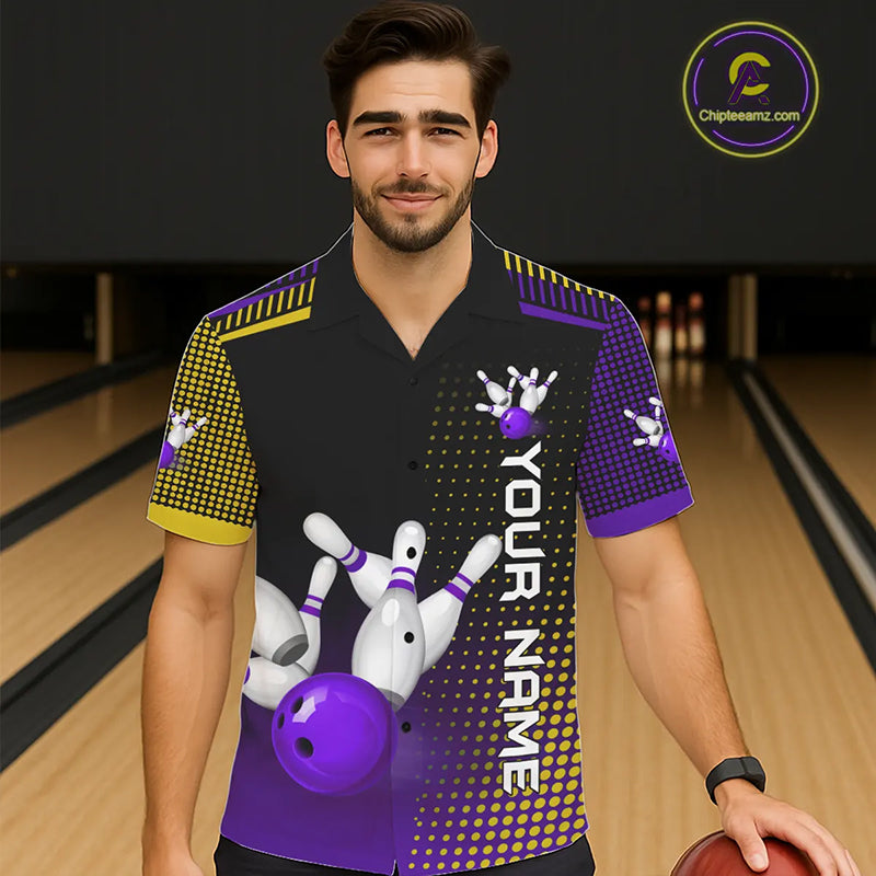Yellow and Purple pattern Bowling Hawaiian Shirt Custom Team Bowling Jerseys, Gift For Bowler NQS11242