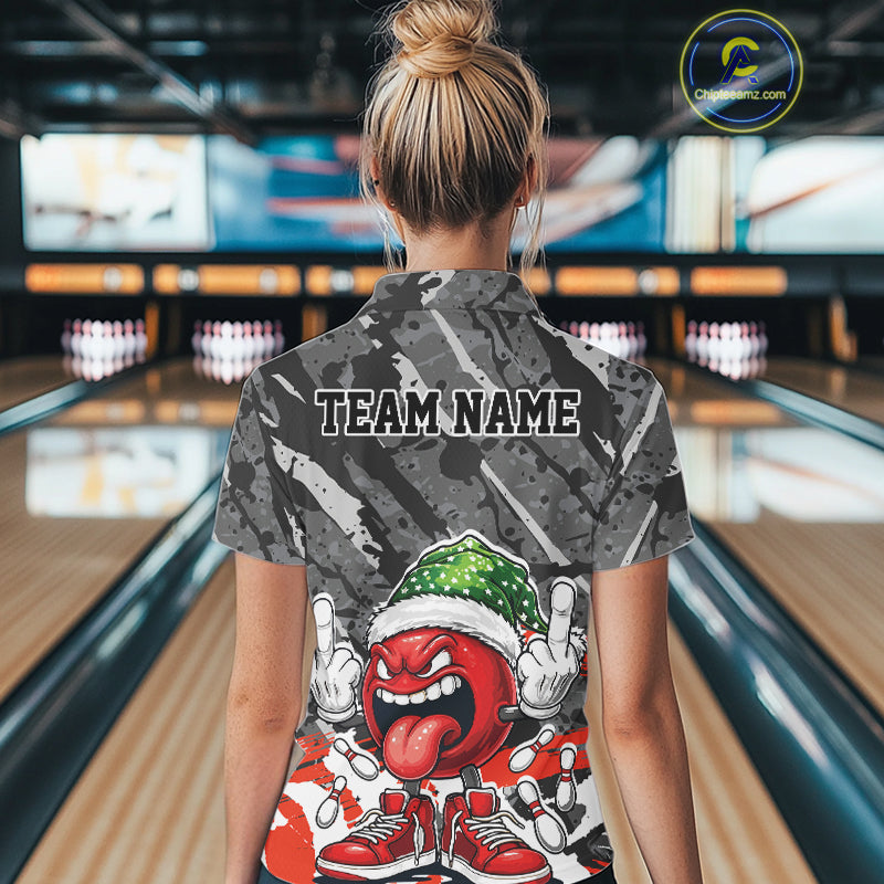 Custom Funny Christmas Bowling Women Polo Shirts, Crazy Bowling Ball Xmas Outfit IPHW10134
