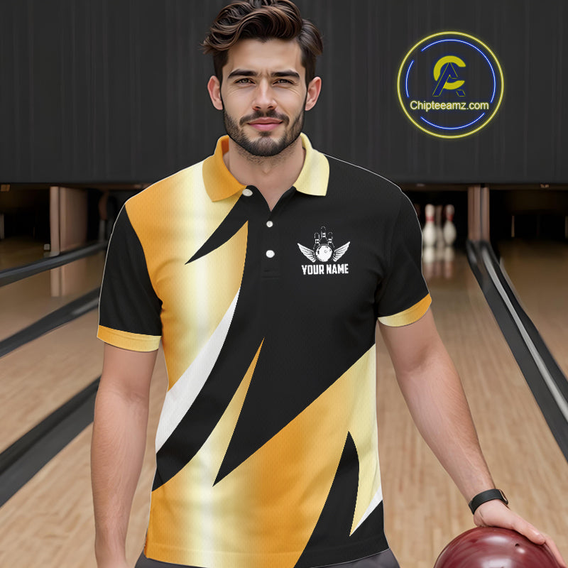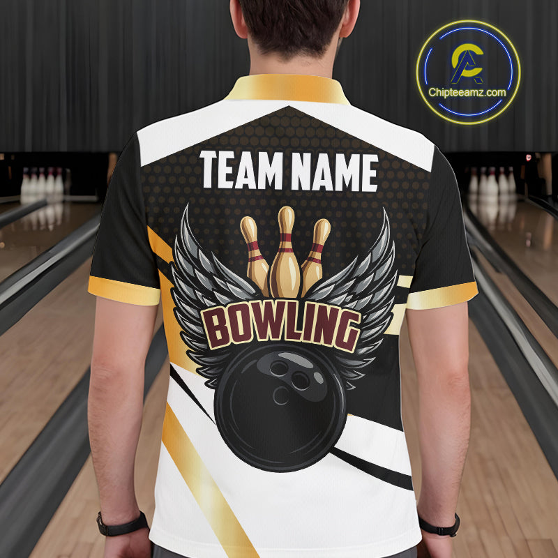 Black and Gold Bowling ball wings Bowling Polo, Quarter Zip Shirts for Men Custom Bowling Team jersey NQS11043