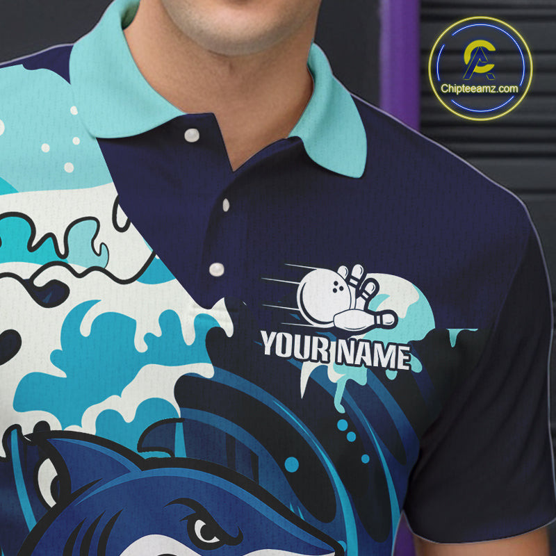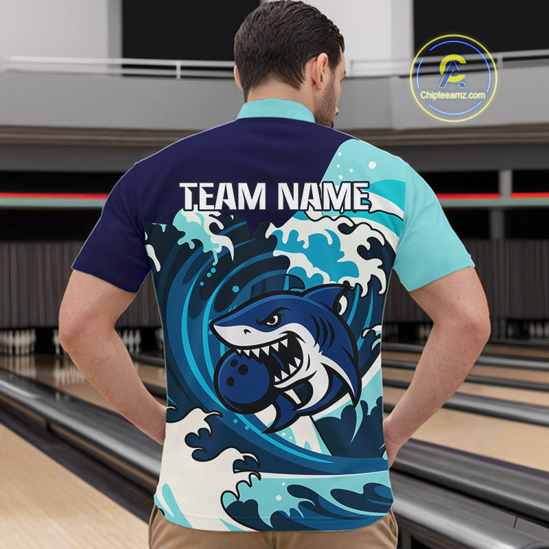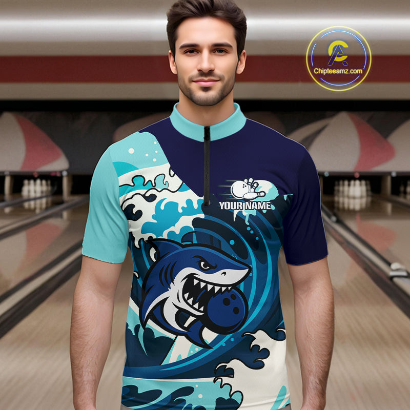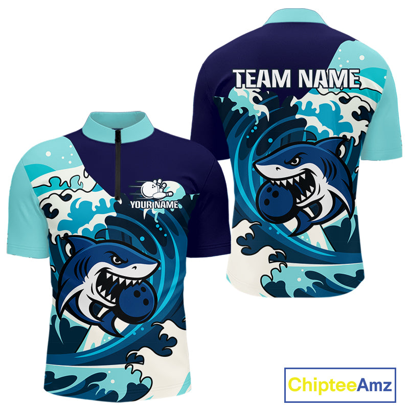 Custom Blue Shark Bowling Polo, Quarter Zip Shirts For Men, Personalized Shark Bowling Team Shirt NQS10469