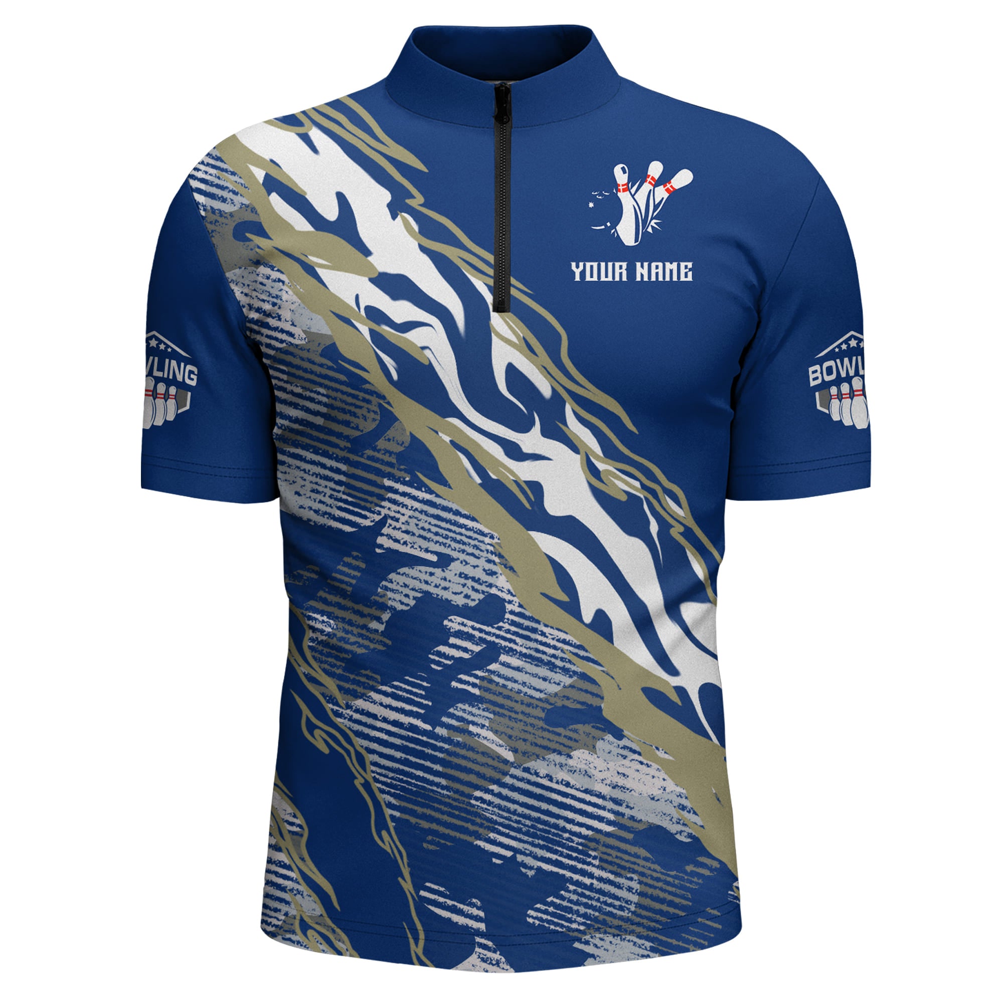 Custom Bowling Shirt for Men Blue Camo Bowling Jersey Flame Bowling Quarter-Zip Shirt BDT261