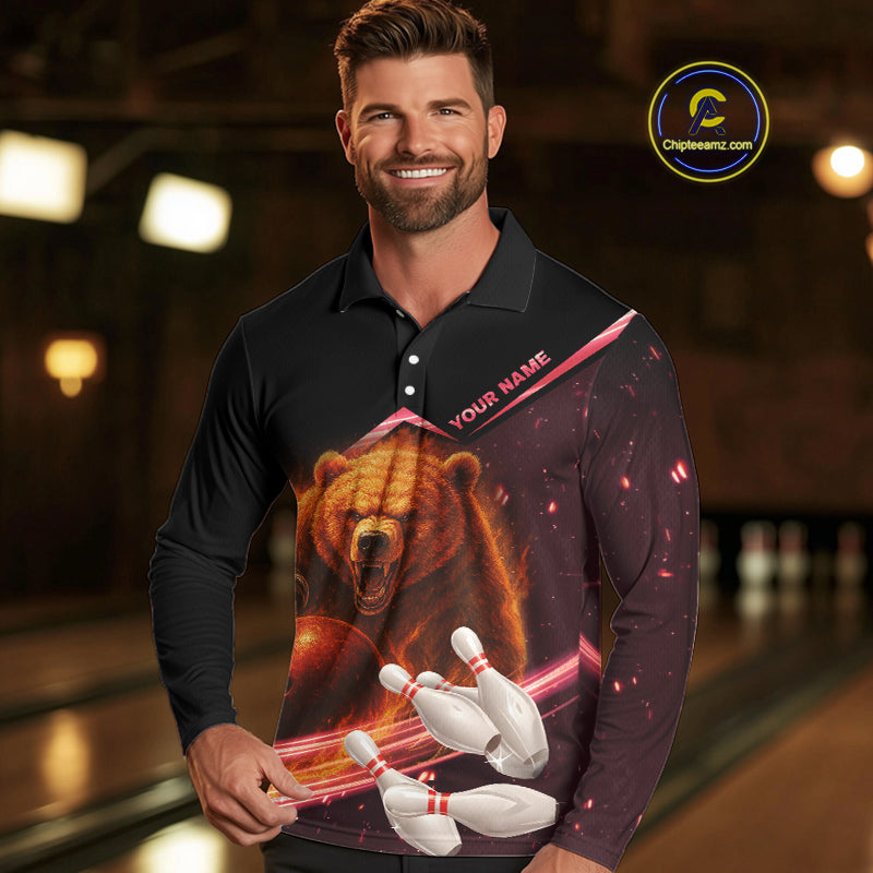 Custom Flame Bear Bowling Team Polo, Quarter zip Shirts For Men, Team Bowling Uniform NQS10321