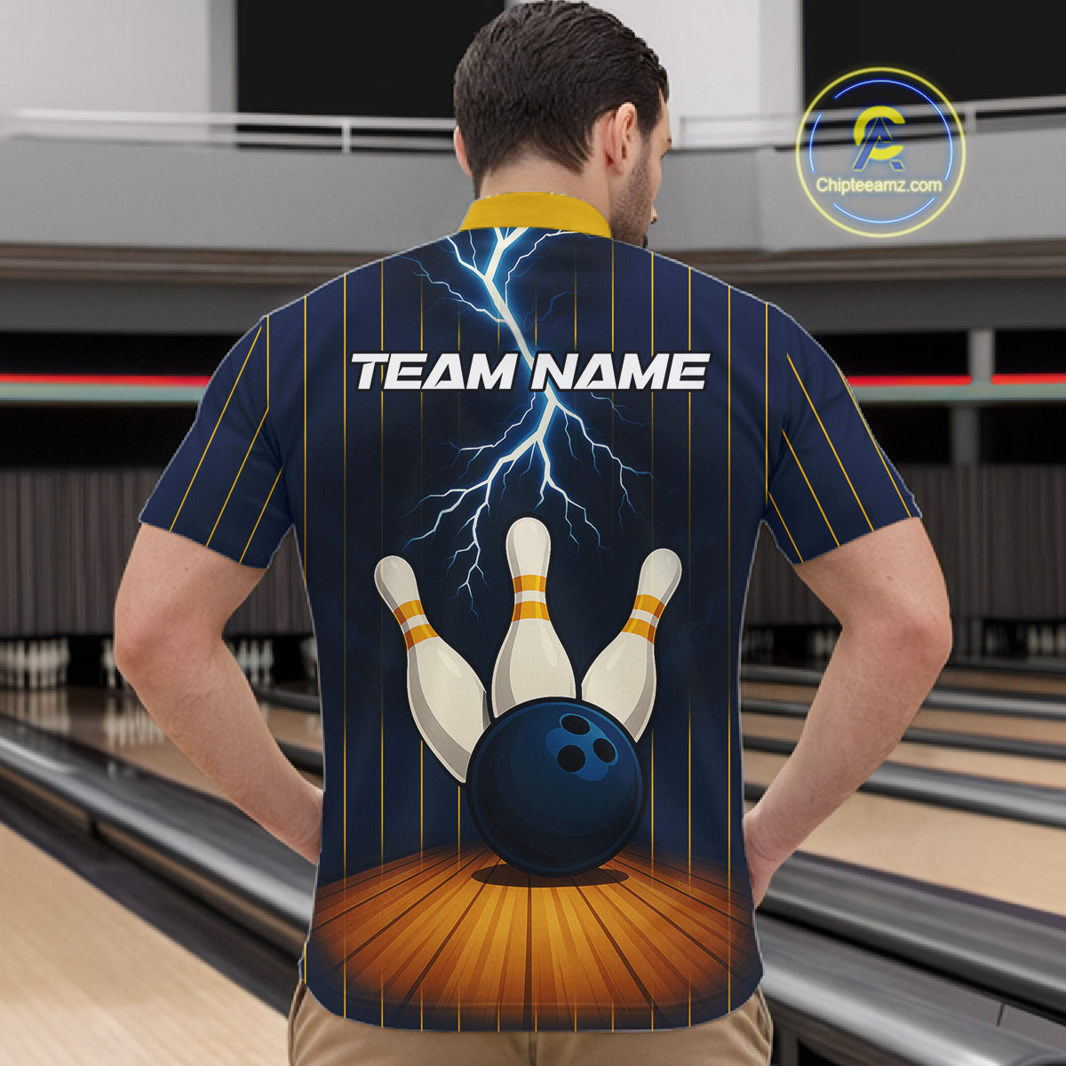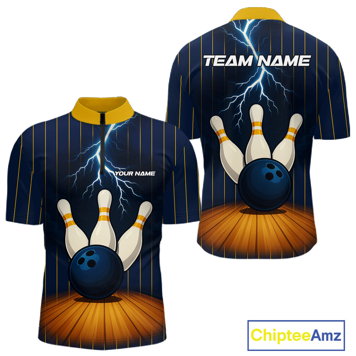 Custom Yellow and Blue Lightning Thunder Bowling Polo, 1/4 Zip Shirts For Men, Team Bowling Outfits NQS10620