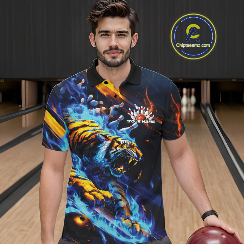 Custom Blue Fire Flame Tiger Bowling Team Polo Shirts For Men, Tiger Bowling Jerseys IPHW9482