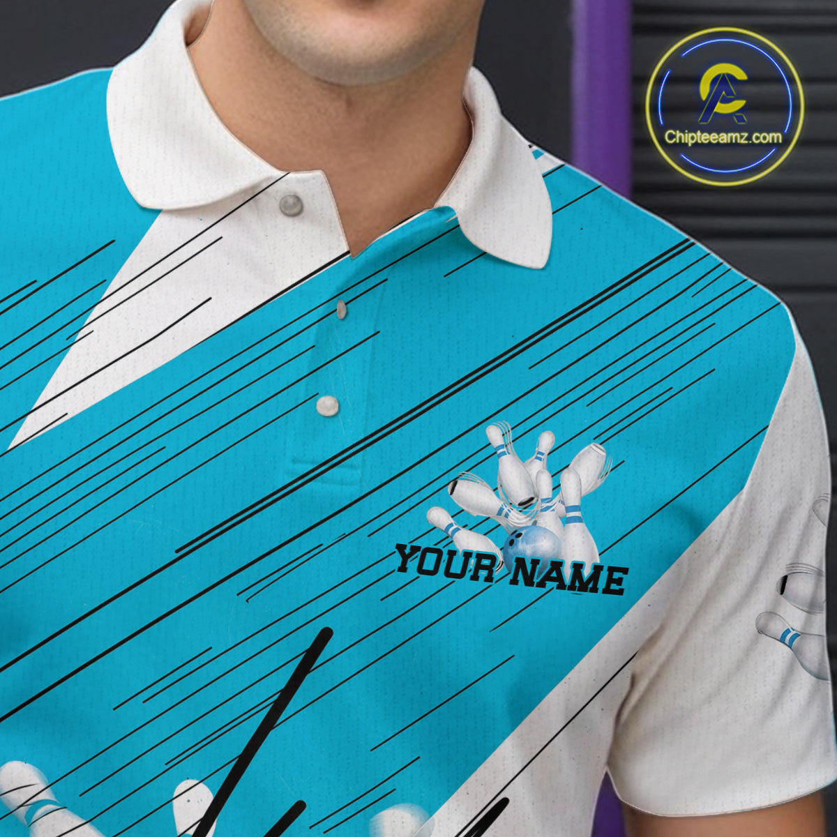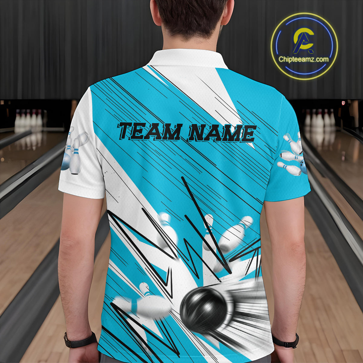 Custom White And Blue Bowling Team Men Polo Shirts, Bowling Ball And Pins Jerseys IPHW9600