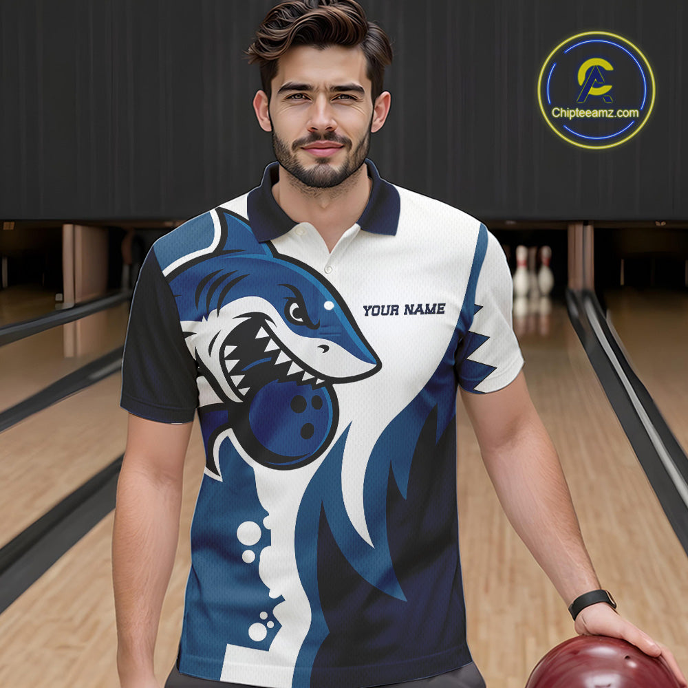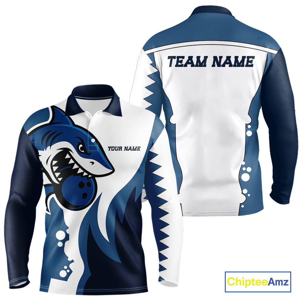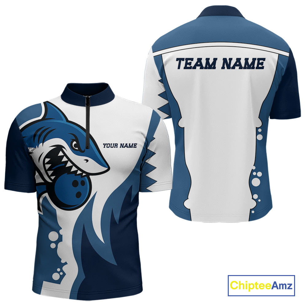 White and Blue Shark Bowling Polo, Quarter Zip shirts for men custom shark bowling team jerseys NQS10159