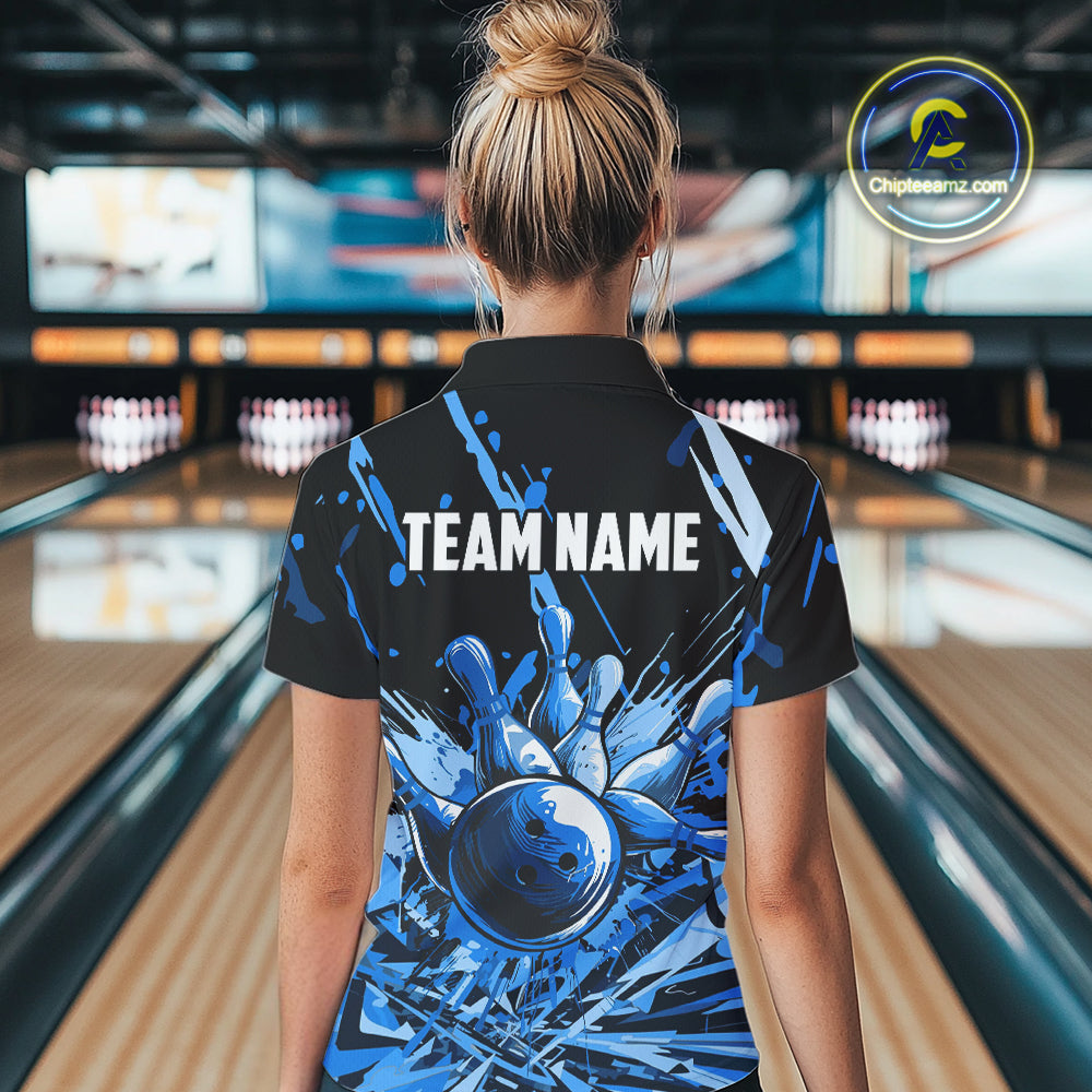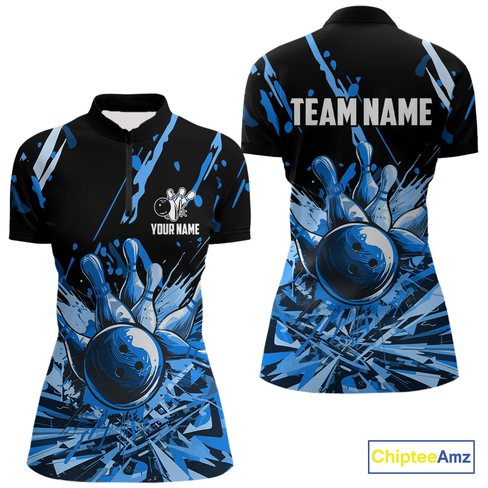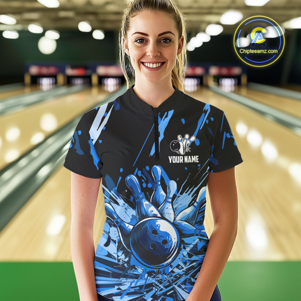 Blue bowling jerseys Bowling Polo, 1/4 Zip Shirt for Women Custom Bowling Team shirts for bowlers NQS11083