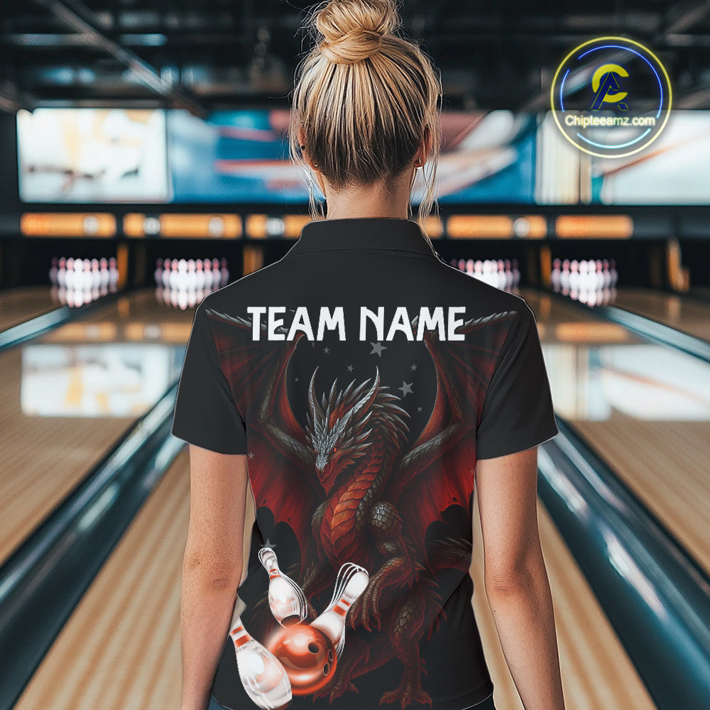 Custom Black And Red Dragon Bowling Shirts For Women, Team Bowling League Shirts NQS11090