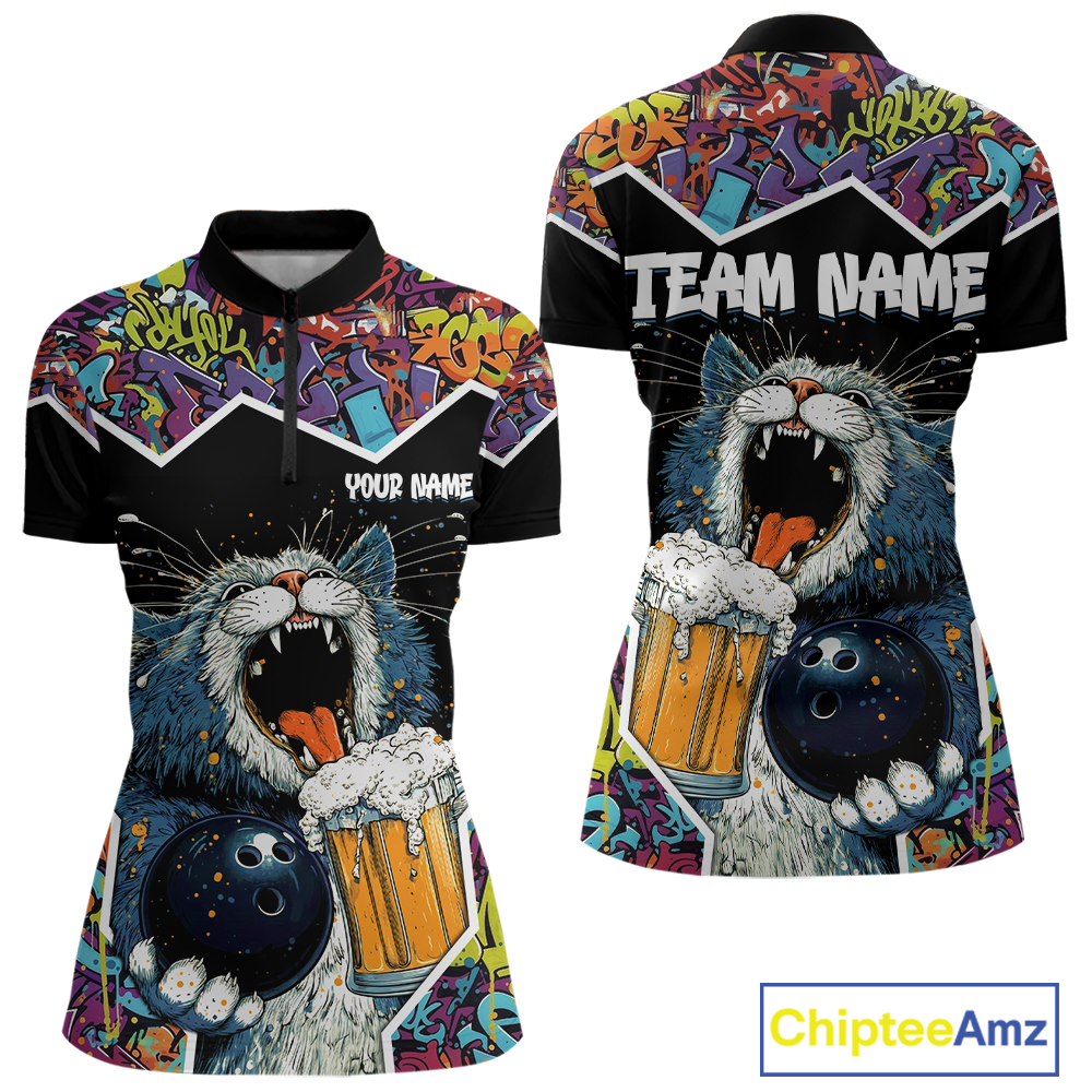Custom Funny Cat Beer Bowling Jersey for Women Polo & 1/4 Zip Bowling Team Shirts HNT146