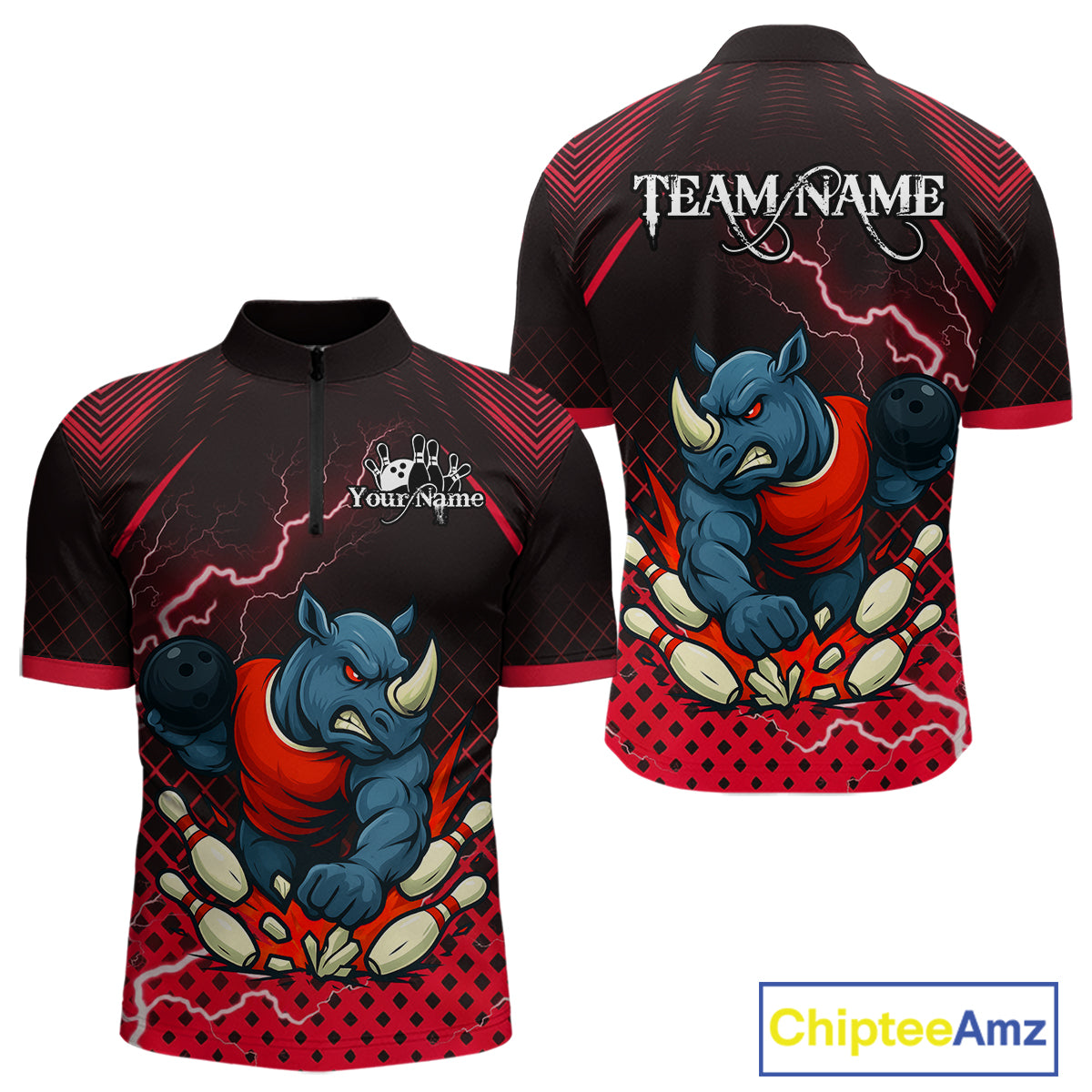 Custom Funny Red Rhino Bowling Team Shirt for Men Bowling Jersey Polo, Quarter-Zip Outfit QZT805