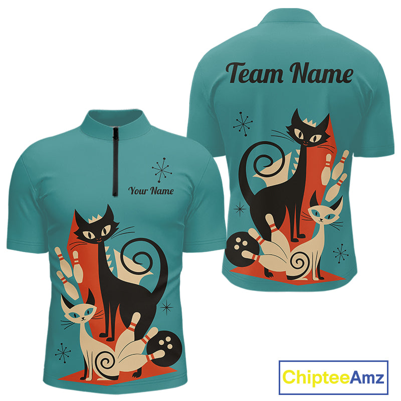Custom retro bowling shirts Cat Bowling jersey for men Team Bowling Polo, 1/4 Zip Shirts | Blue NQS11072