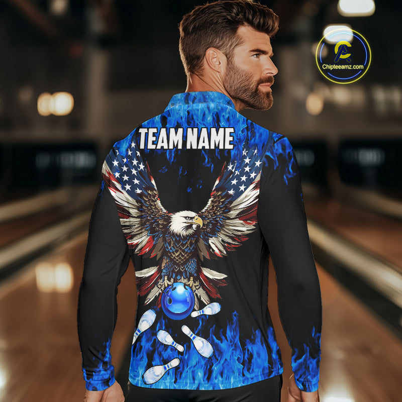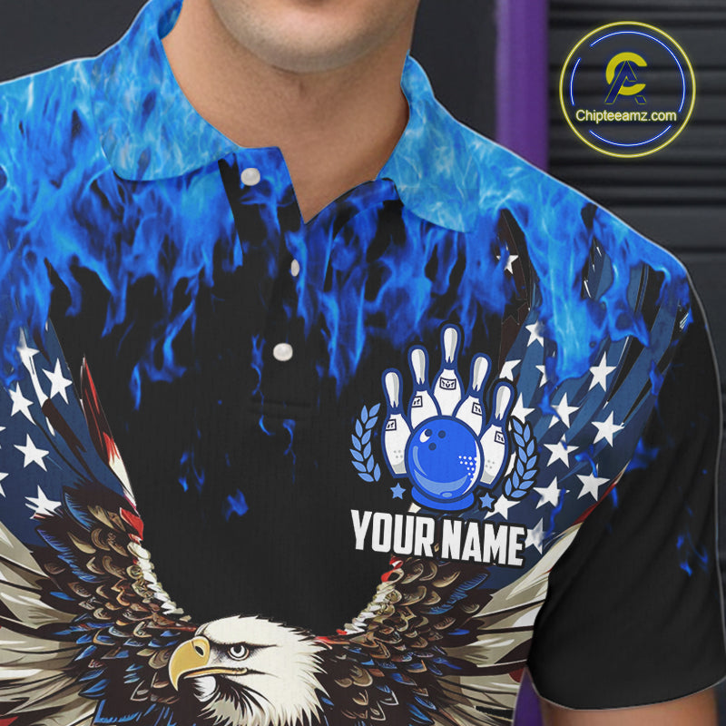 Blue flame Mens bowling polo shirts Custom American flag Eagle Team bowling shirts, gift for bowlers NQS7403