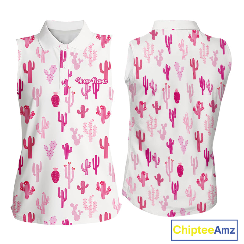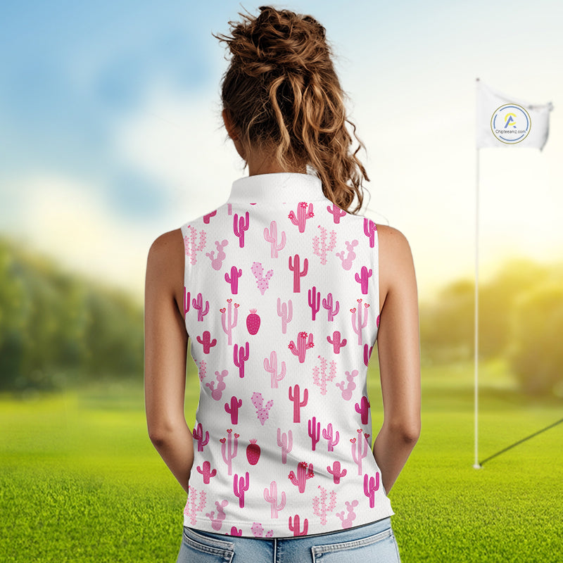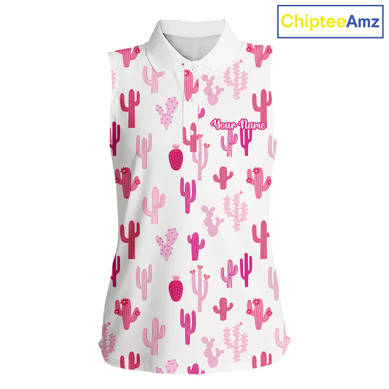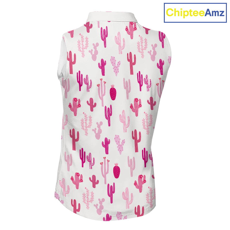 Funny Pink Cactus Pattern Womens Sleeveless Golf Polo Shirts Custom Cactus Ladies Golf Attire, Golf Gift NHN0185