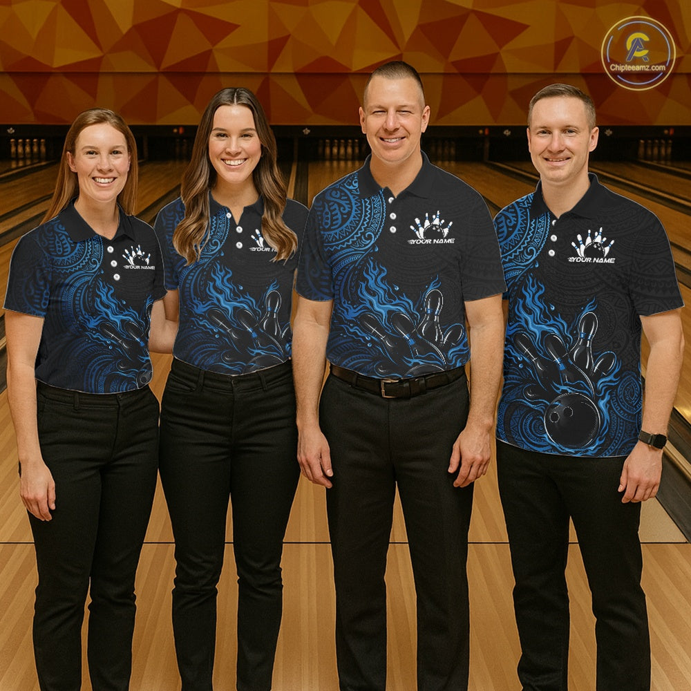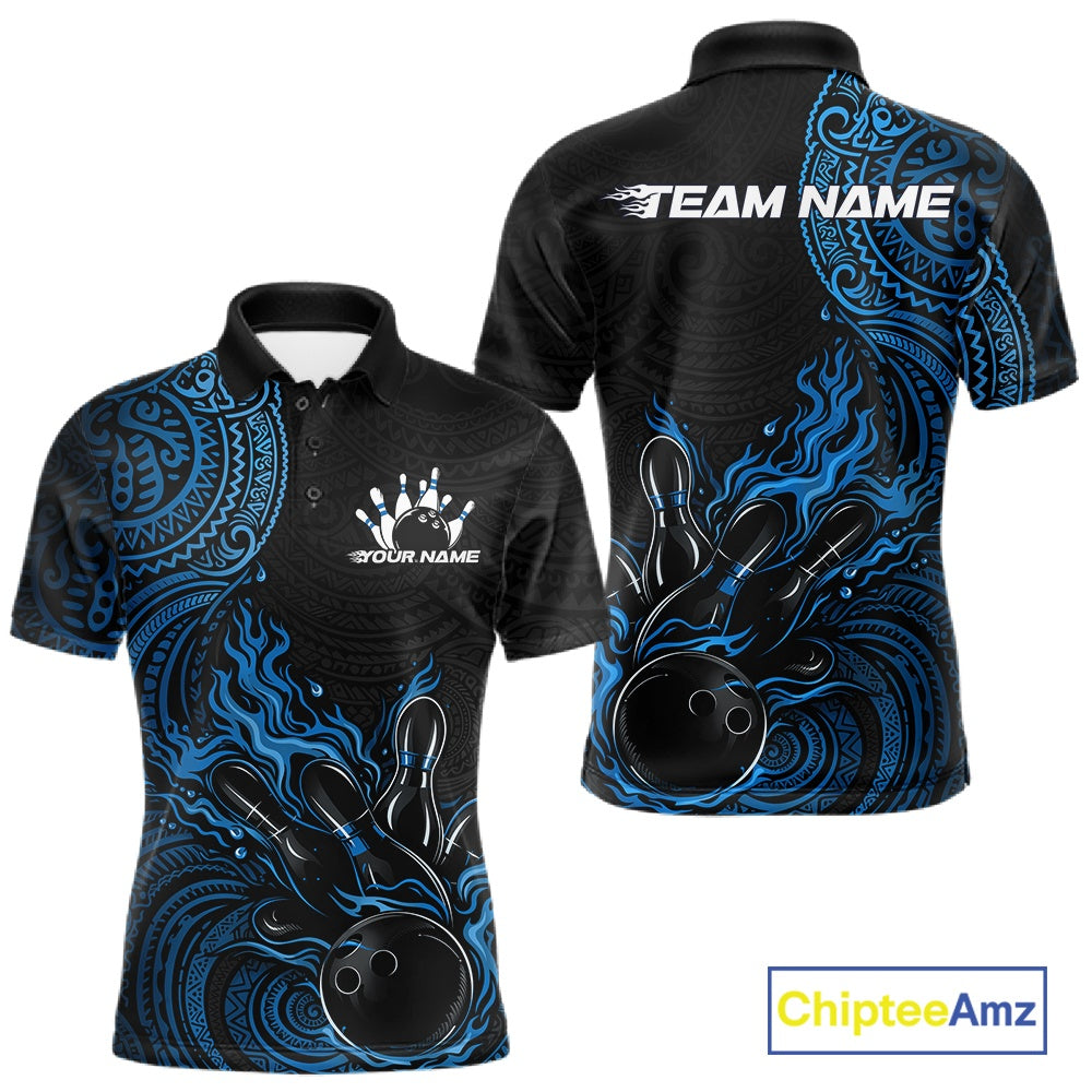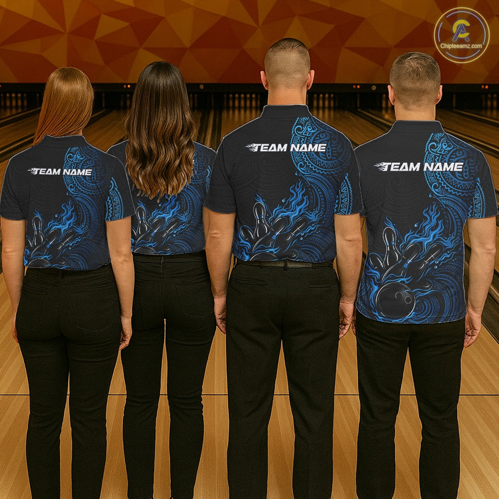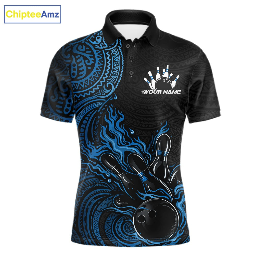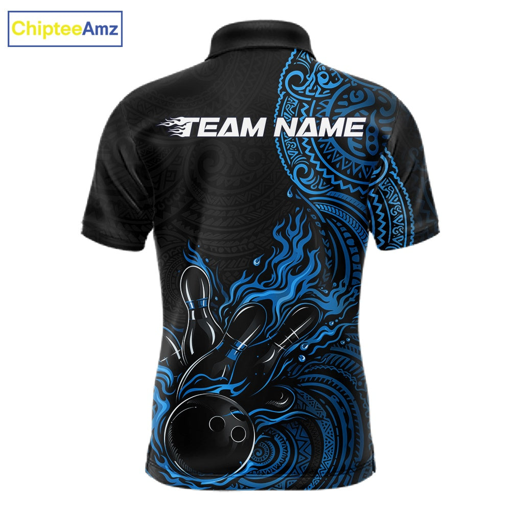 Custom Black And Blue Tribal Flame Bowling Ball Bowling Team Shirts, Polynesian Bowling Tournament Shirt IPHW10499