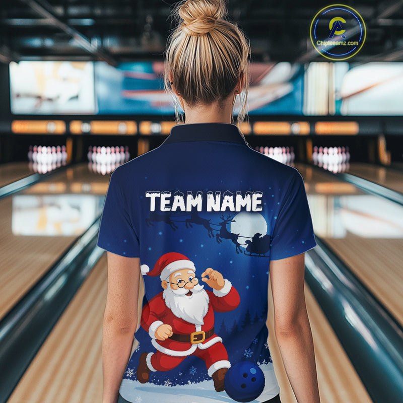 Custom Blue Funny Christmas Santa Bowling Polo, 1/4 Zip Shirt For Women, Bowling Team League Jersey NQS10827