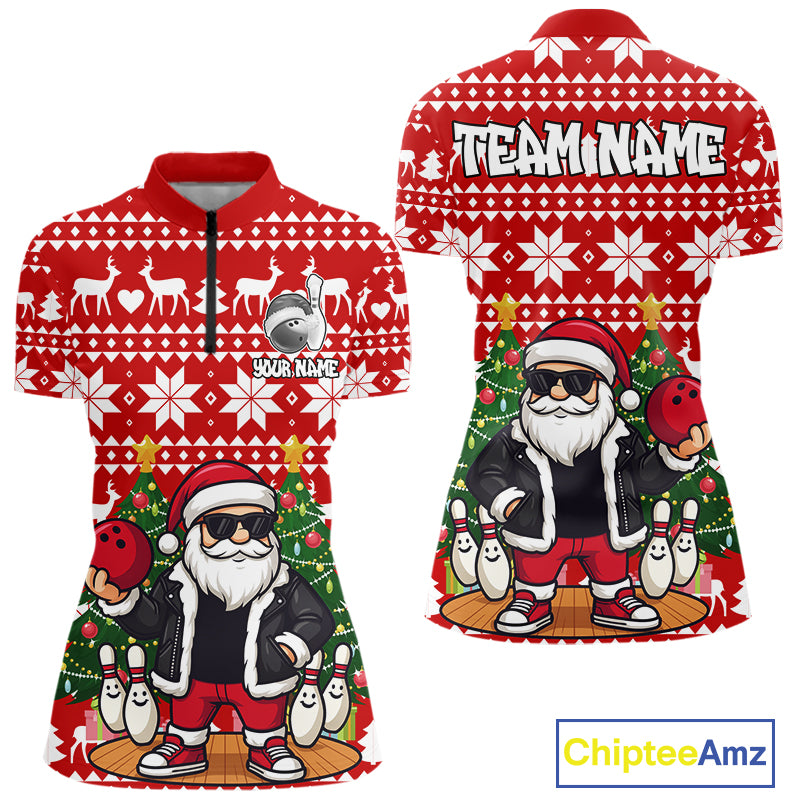Funny Santa Christmas Women Bowling Polo, Quarter Zip Shirt Custom Team Bowling Jersey | Red NQS10936