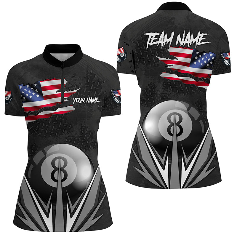 American Flag 8 Ball Pool Custom Name Black Billiard Jerseys For Women, Patriotic Billiard Shirts TDM1905