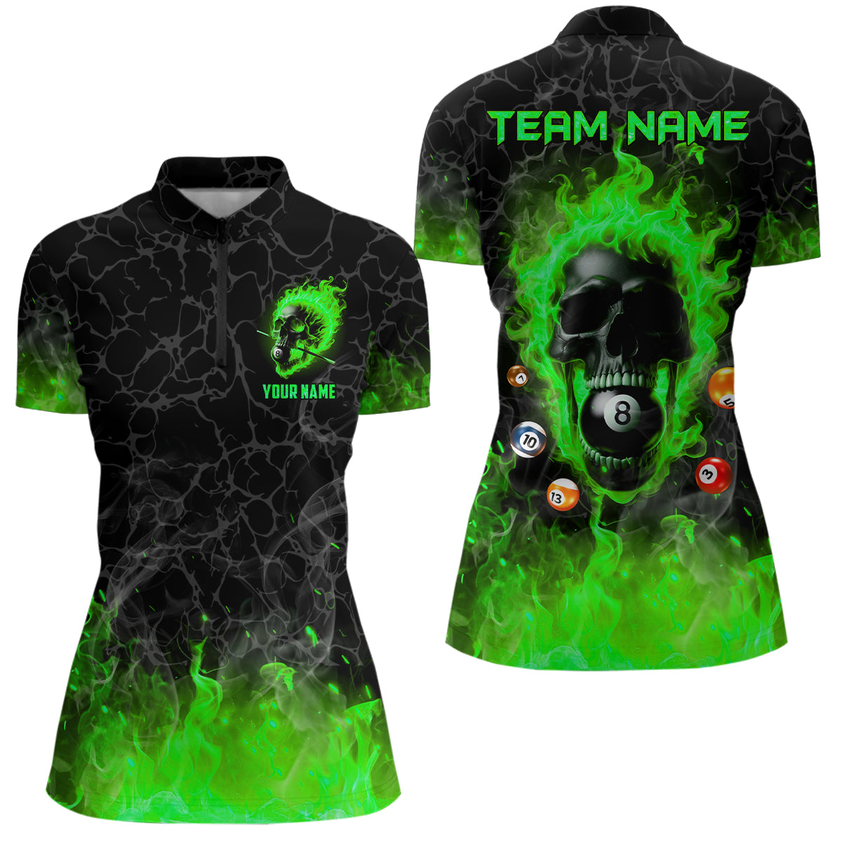 Billiards 8 Ball Flame Skull Fire Custom Pool Shirts For Women, Unique League Billiard Jerseys |Green TDM2010