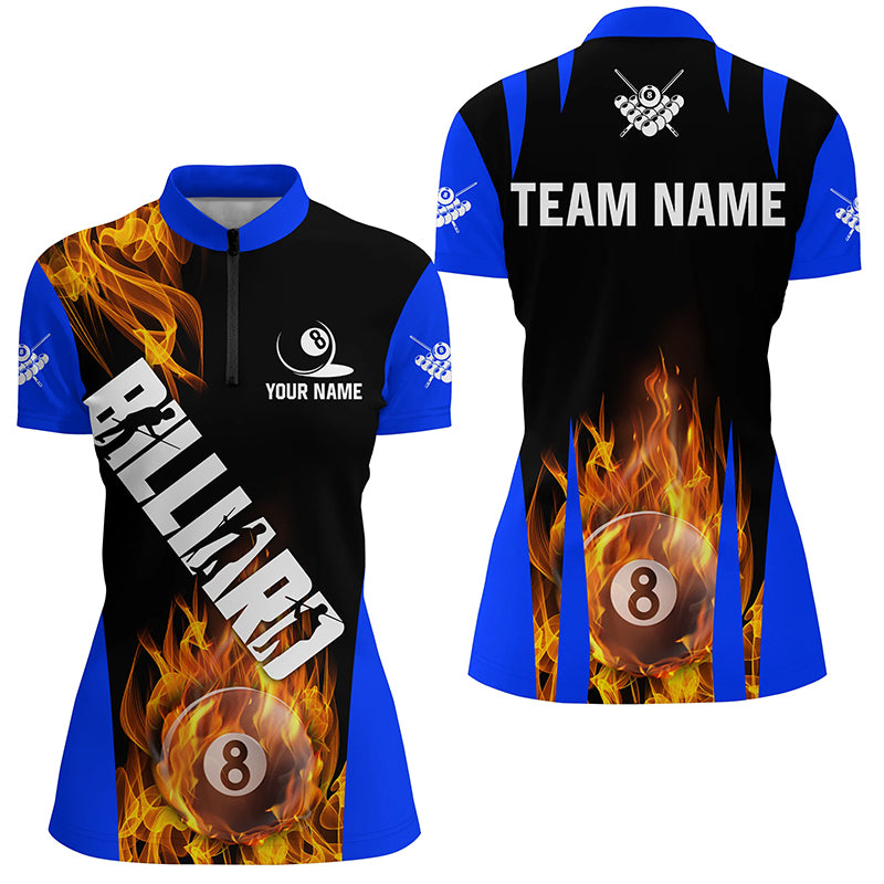 Personalized Flame 8 Ball Pool Fire Billiard Shirts For Women Custom Blue And Black Billiard Jerseys TDM2058