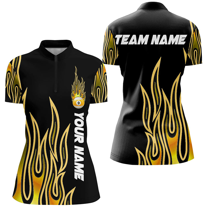 Fire Flame Yellow 9 Ball Pool Custom Black Billiard Shirts For Women, Best 9 Ball Jerseys Apparel TDM2288