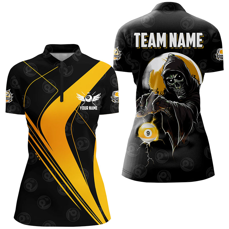 Customized Yellow Black Death Skeleton 9 Ball Billiard Shirts For Women, 9 Ball Pool Team Jerseys TDM2502