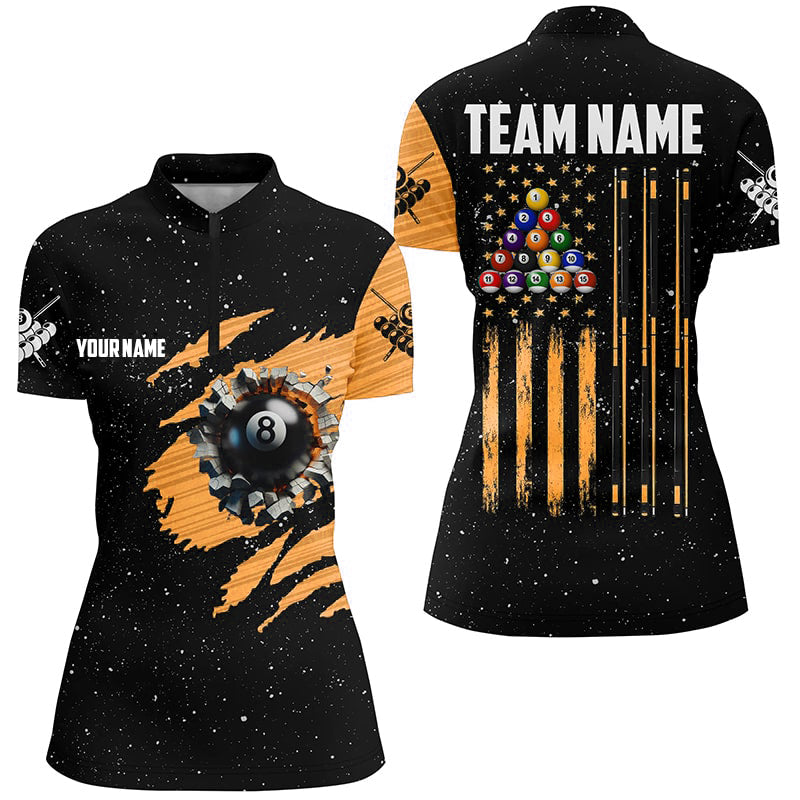 Customized Grunge American Flag 8 Ball Pool Women Billiard Polo Shirts, Pool Player Shirts |Orange TDM3171