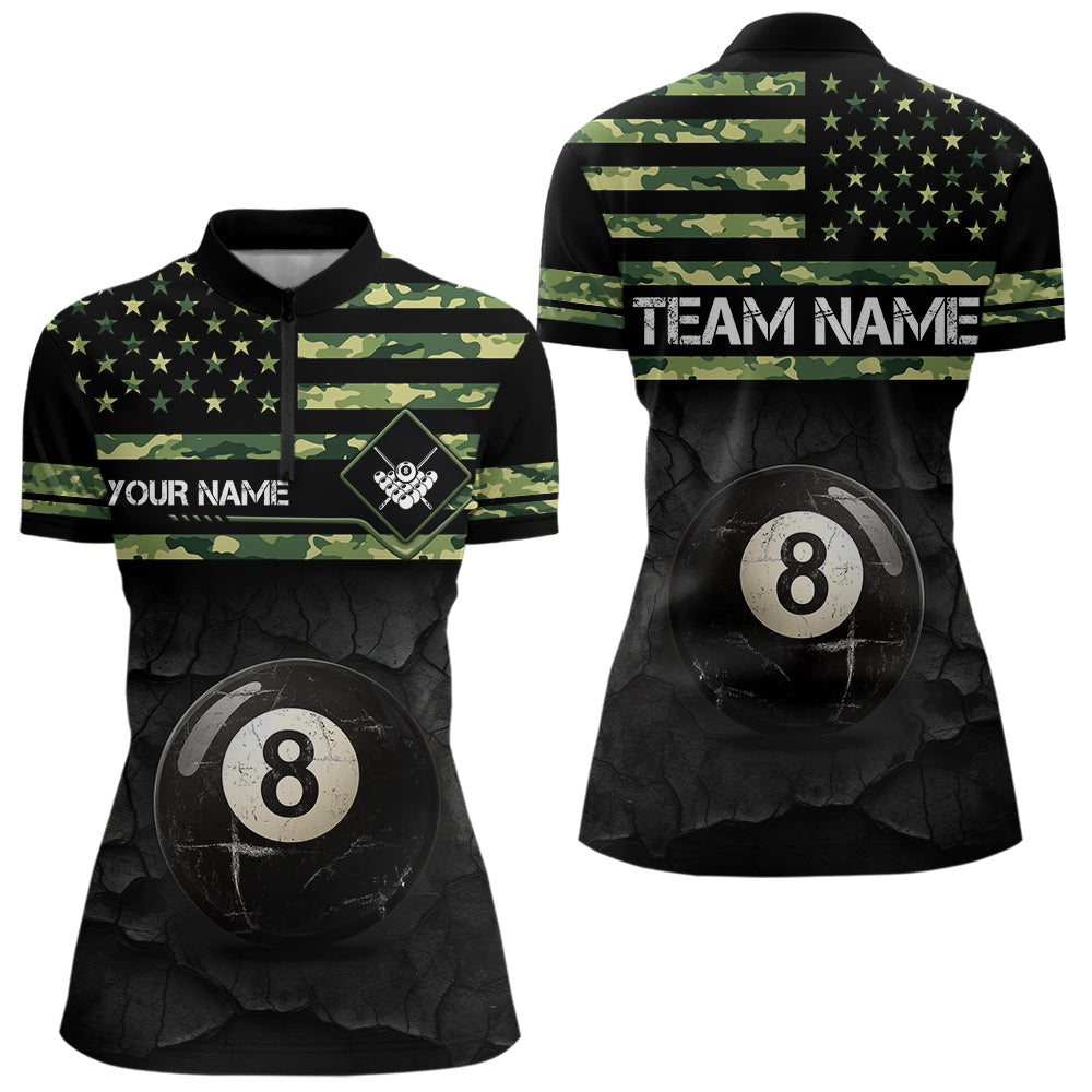 Customized Retro 8 Ball Pool Green Camo US Flag Billiard Shirts For Women, Patriotic Billiard Jerseys TDM3566